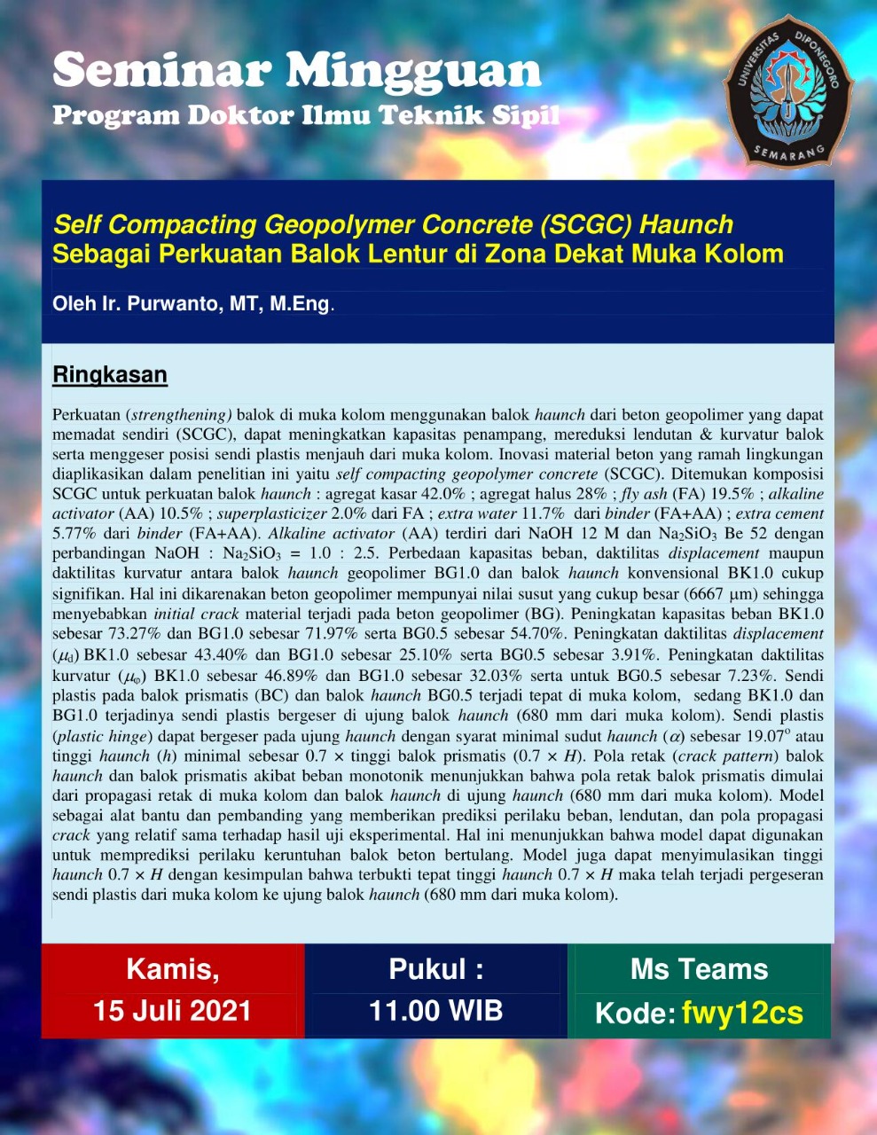 Self Compacting Geopolymer Concrete (SCGC) Haunch Sebagai Perkuatan Balok Lentur di Zona Dekat Muka Kolom |