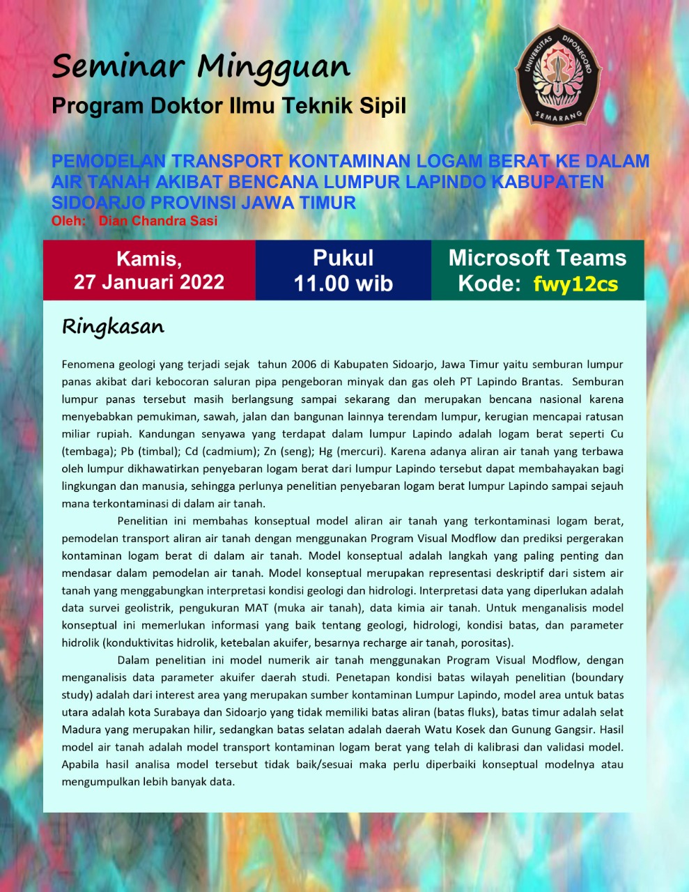 Pemodelan Transport Kontaminan Logam Berat Ke Dalam Air Tanah Akibat Bencana Lumpur Lapindo Kabupaten Sidoarjo Provinsi Jawa Timur |