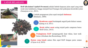 The low utilization of Reclaimed Asphalt Pavement (RAP) waste as the main material for rigid pavement is due to weaknesses in the bond of the existing aggregate asphalt layer.