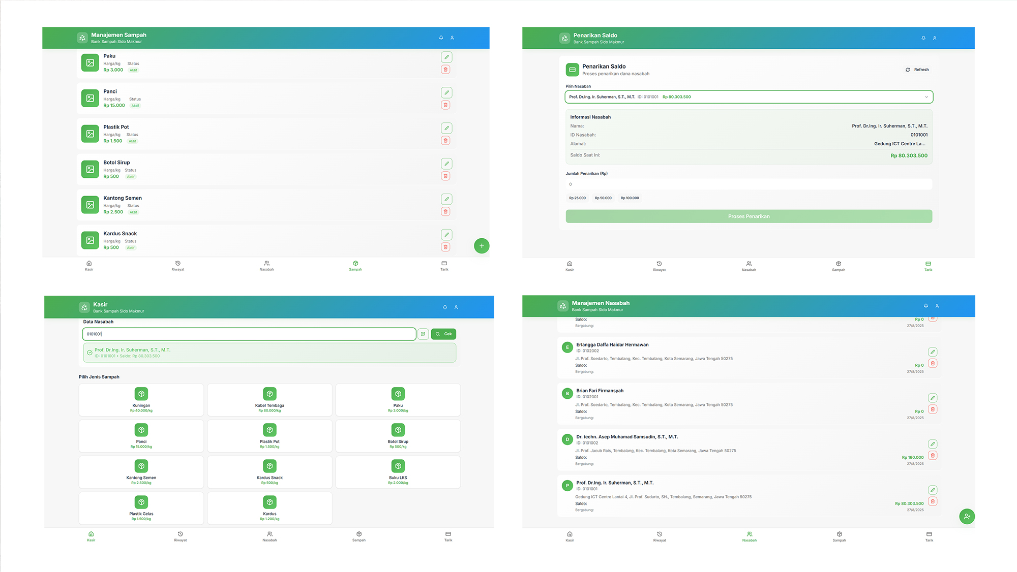 “Situs web administrasi bank sampah digital ini memiliki cara kerja sederhana. Warga membawa sampah yang telah dipilah untuk kemudian ditimbang oleh petugas, lalu data jenis sampah, berat, dan harga per kilogram dimasukkan ke dalam sistem. Nilai ekonomi dari setoran dihitung otomatis, tersimpan secara real-time dalam database, dan menambah saldo nasabah,” ucap Brian.